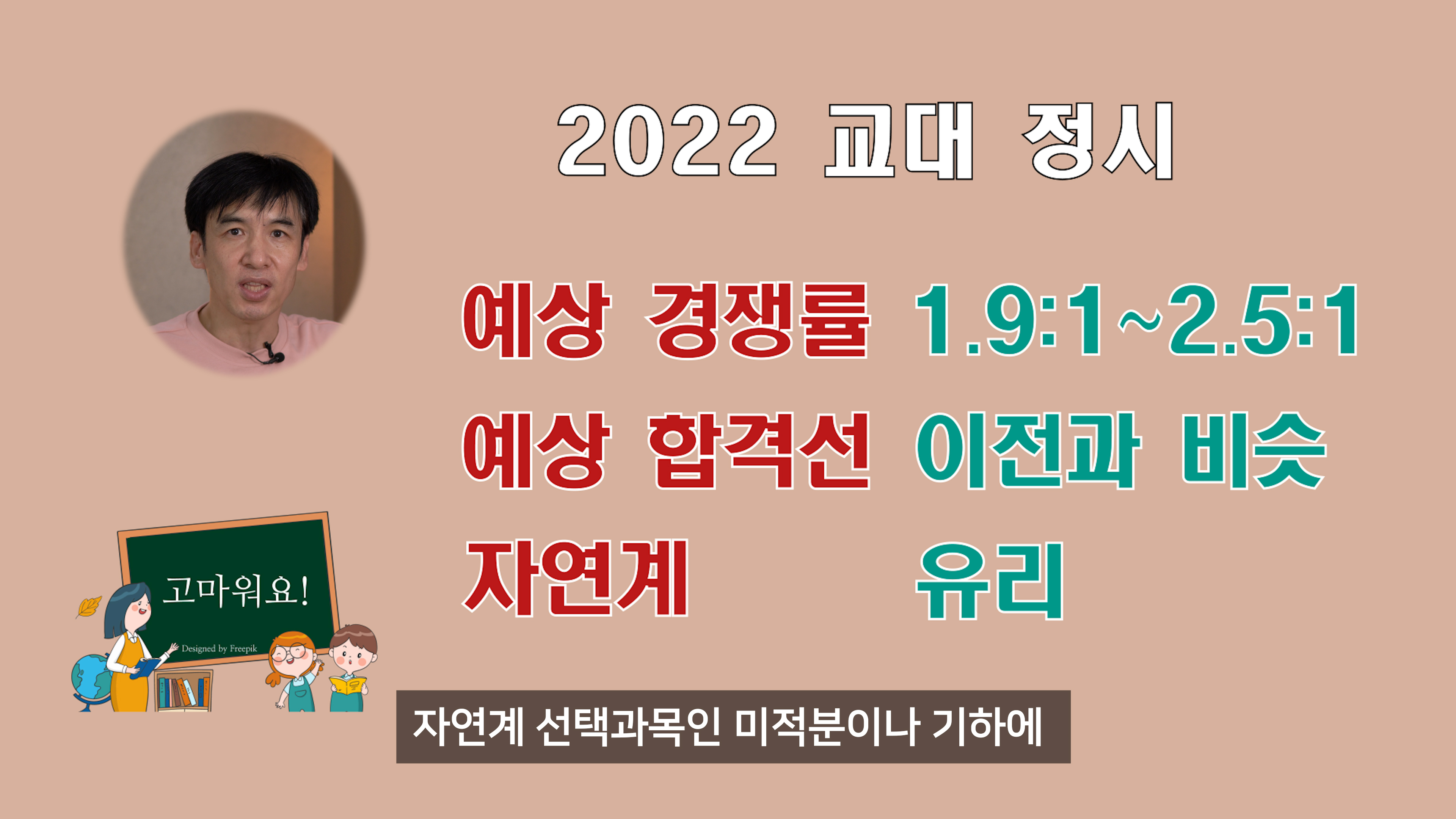 올해부터 도입한 선택형 수능은 교대지원 자연계 학생들에게 유리하게 작용합니다. 일부교대는 자연계 선택과목인 미적분이나 기하에 가산점을 주기 때문입니다. 이로 인해 자연계 학생들 지원이 늘어나면서 합격선이 올라갈 수도 있습니다.