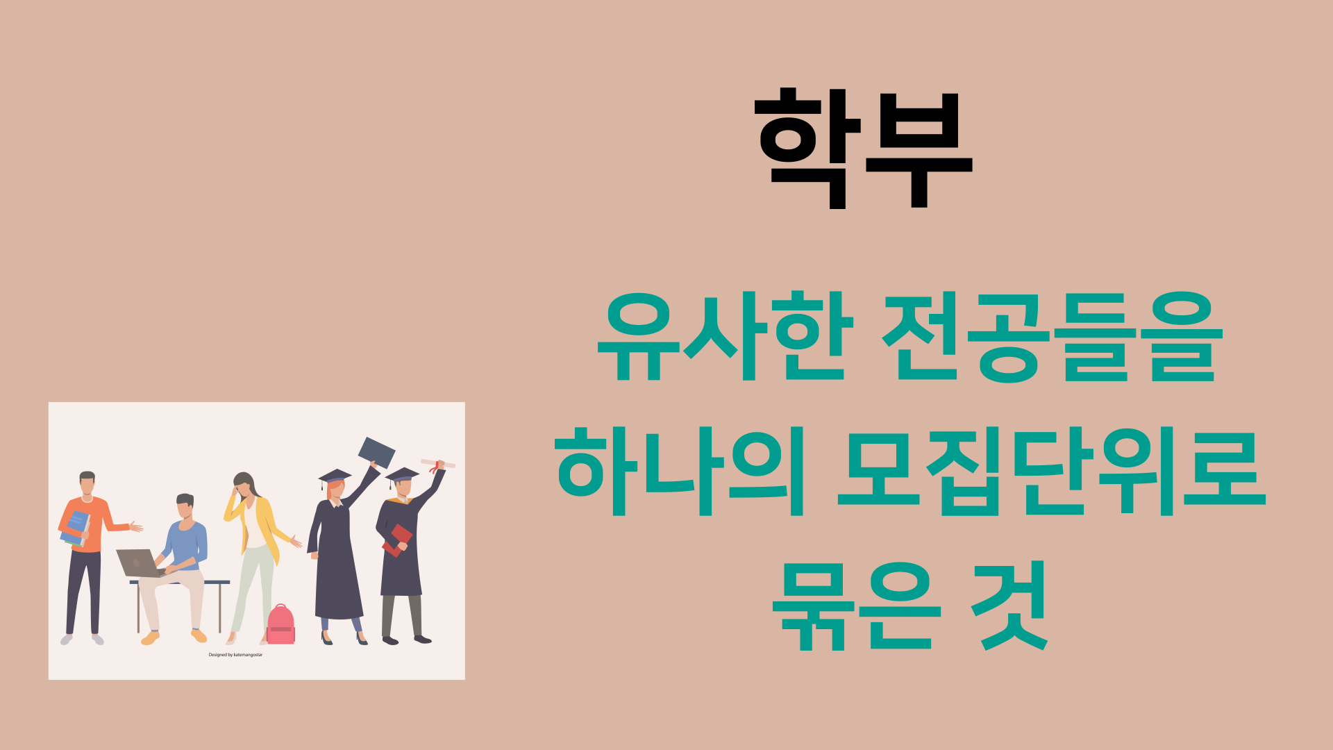 유사한 전공들을 하나의 모집 단위로 묶은 것입니다. 전공 간의 유사성이 없는 경우도 있습니다. 1학년 때는 전공을 정하지 않고 포괄적으로 공부합니다. 2학년이 되면 전공을 선택해서 공부합니다. 모집 단위학부 이름은 대학마다 다릅니다. 그러므로 모집요강을 잘 살펴야 합니다. 또한 이름이 같은 학부라도 전공과목들이 같지는 않습니다.