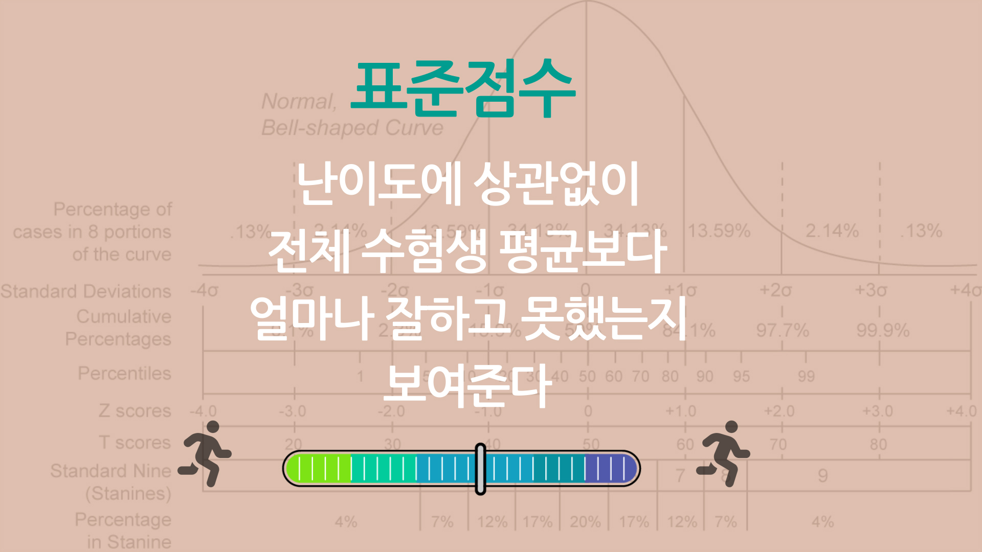 이러한 문제를 해결하기 위해서 표준점수를 사용합니다. 난이도에 상관 없이 전체 수험생 평균보다 얼마나 잘하고 못했는지 보여줍니다.