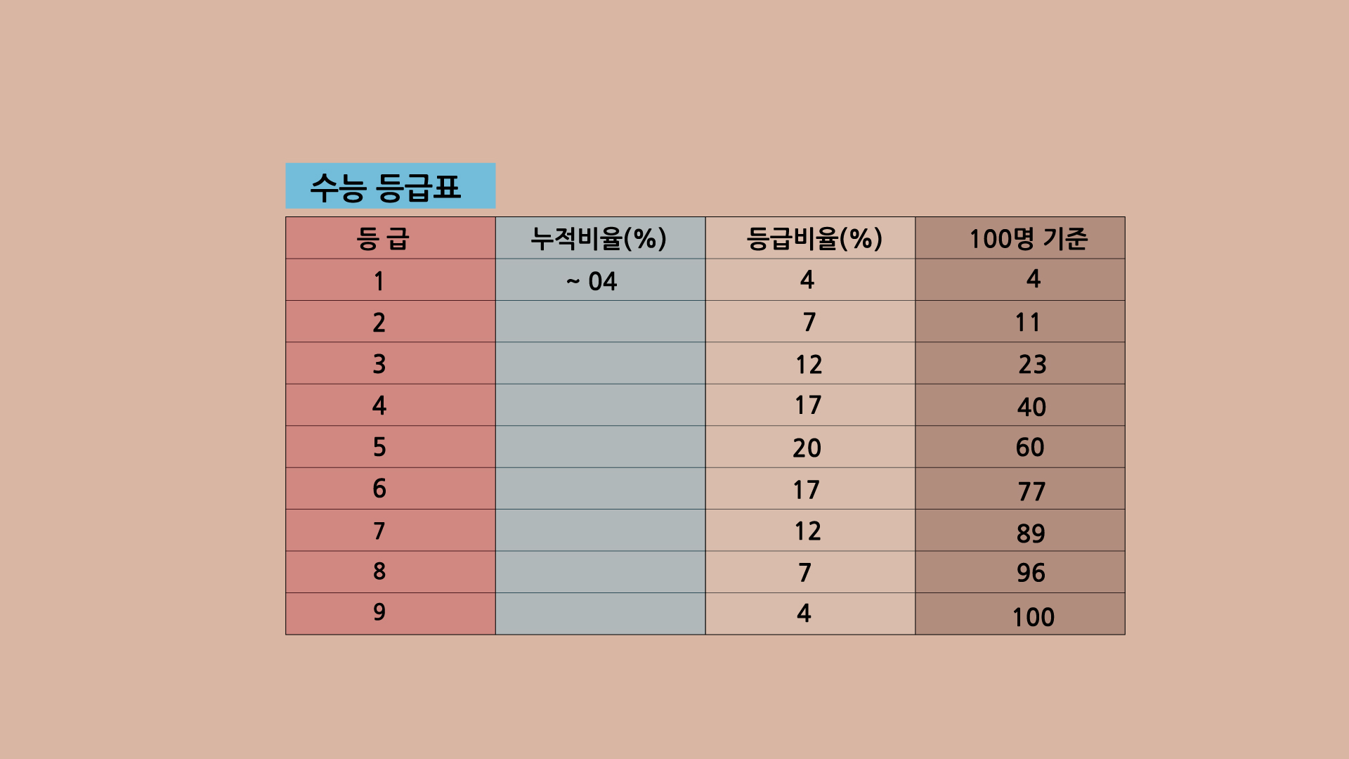 표준점수를 비율에 따라 아홉 구간으로 나눈 것입니다. 1등급은 상위 4%로 2등급은 11%로 3등급은 23%로 4등급은 40%등으로 구분합니다.