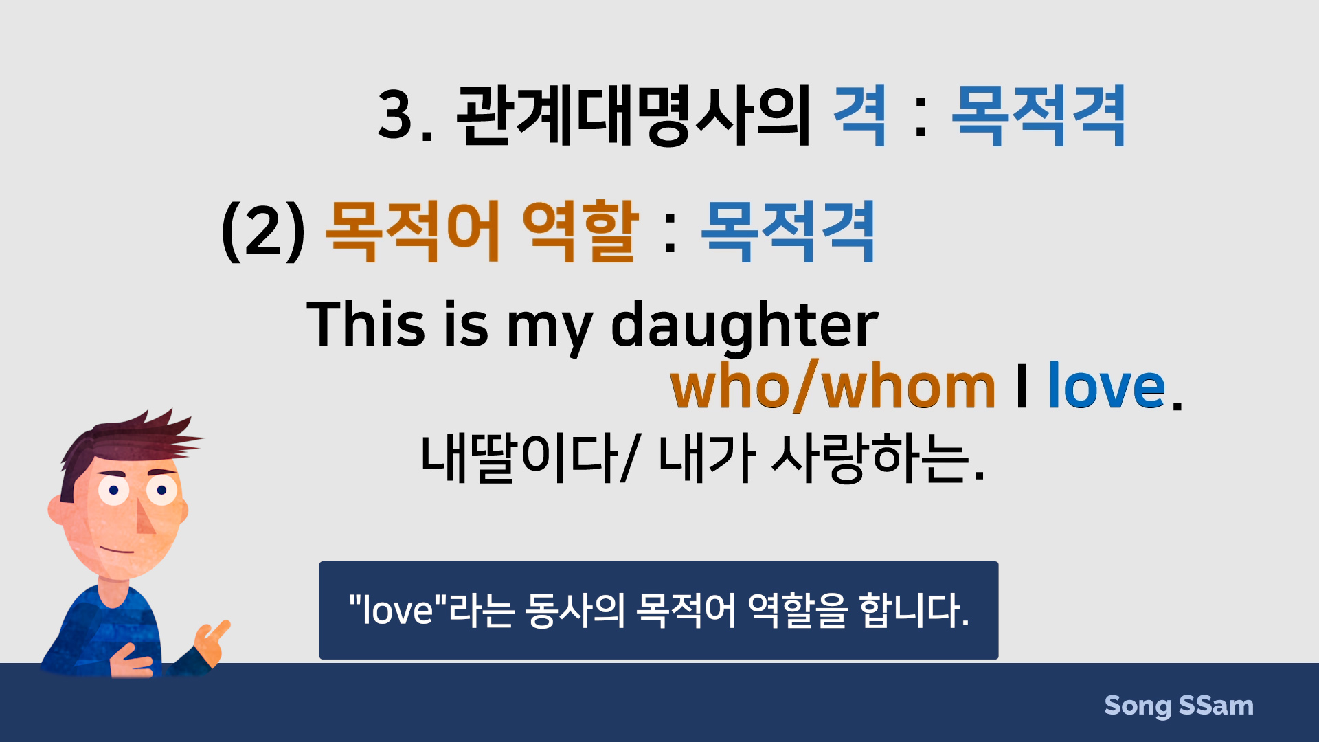 → (관계대명사 whom은 타동사 love 목적어 역할을 하는 목적격 관계대명사)
