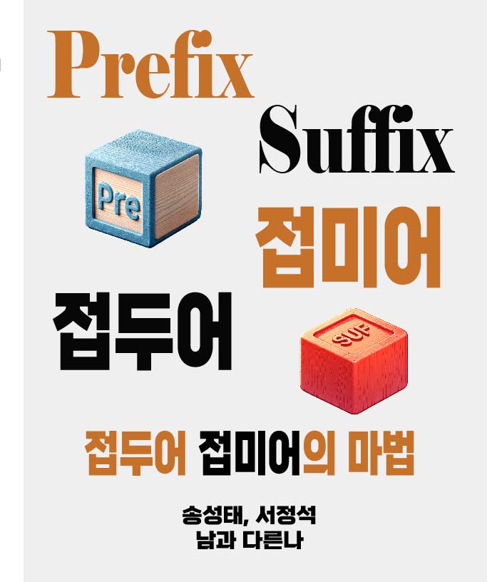 다음은 제가 쓴 "접두어 접미어" 책입니다. 영어에서 아주 많이 쓰이는 접두어 접미어들을 모아 의미를 설명했습니다. 예문과 함께 읽으면 단어 실력 향상에 큰 도움이 될 것이라 확신합니다.
